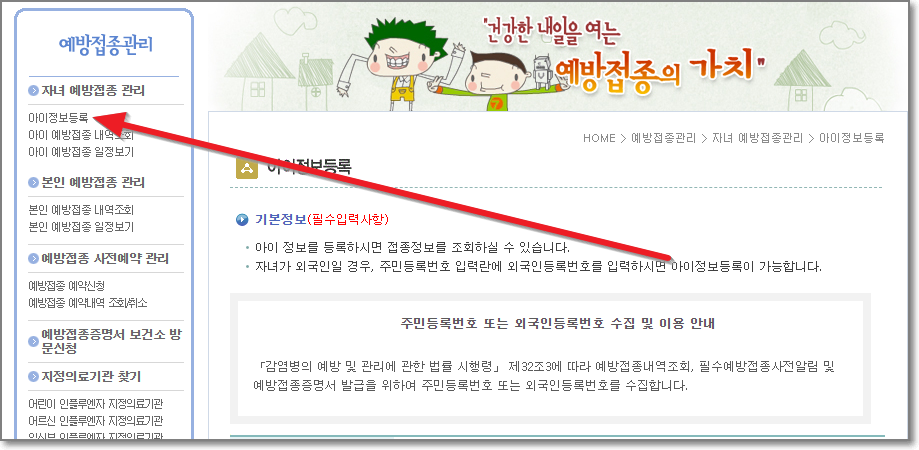 아이정보등록은 왼쪽 메뉴의 "아이정보등록"으로 하실 수 있습니다. 눌러보세요.