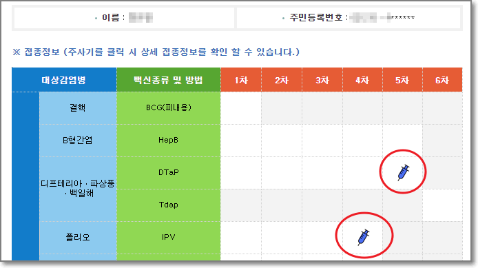 등록된 아이의 접종내역을 확인할 수 있음을 알 수 있습니다.