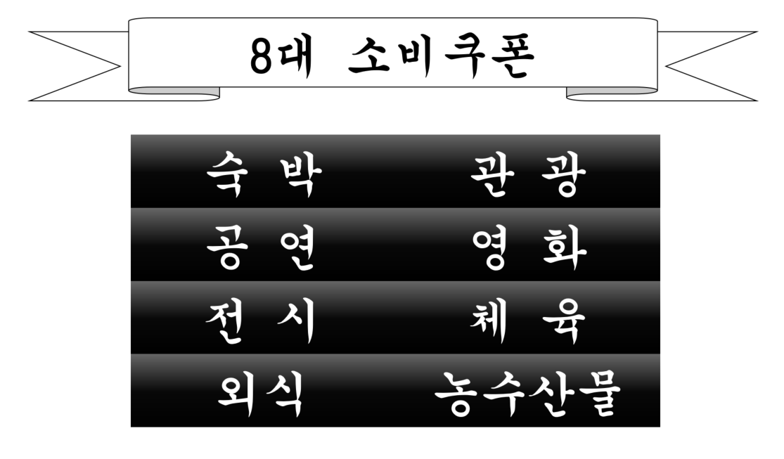 1.숙박, 2.관광, 3.공연, 4.영화, 5.전시, 6.체육, 7.외식, 8.농수산물 입니다.