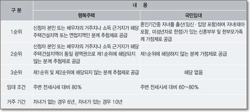 혼인 2년 이내 신혼부부, 예비 신혼부부 및 만 2세 이하(만3세미만) 자녀를 둔 한부모 가족에게 가점제로 우선공급