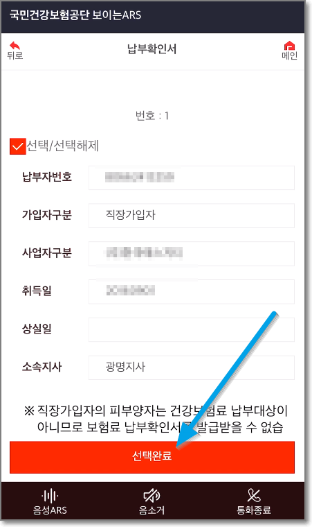 발급용도로 "납부확인용"을 선택하고 신청기간은 최근1년, 세부보험은 건강,장기요양보험을 선택하고 "선택완료"를 누른후 상태를 확인한 후 "선택완료"를 누릅니다.