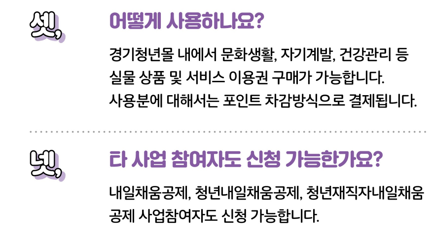 경기청년몰 내에서 문화생활, 자기계발, 건강관리 등 실물상품 및 서비스 이용권 구매가 가능하며, 사용분에 대해서 포인트 차감방식으로 결제가 됩니다.