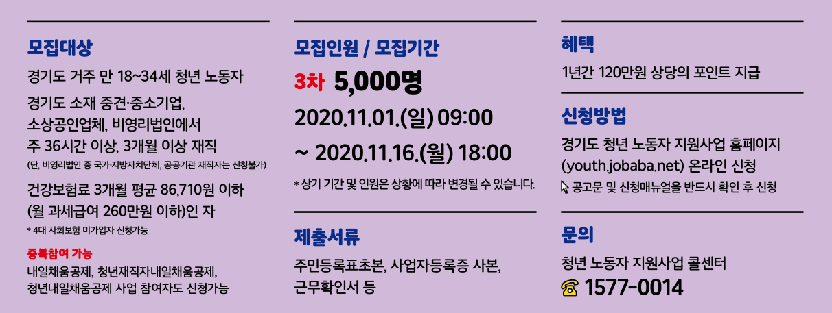 대 상 자 : 경기도 소재 중소·중견기업, 소상공인업체, 비영리법인에서 주36시간 이상 근무하는 재직자 중 월 급여 260만원 이하인 만18~34세 청년 노동자(건강보험료 3개월 평균 86,710원 이하)