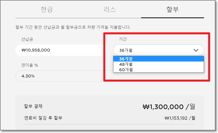 그다음으로 할부를 보면, 36개월~60개월 까지 선택이 가능하며, 역시 이율은 몇개월로 하나 똑같이 4.3%입니다.