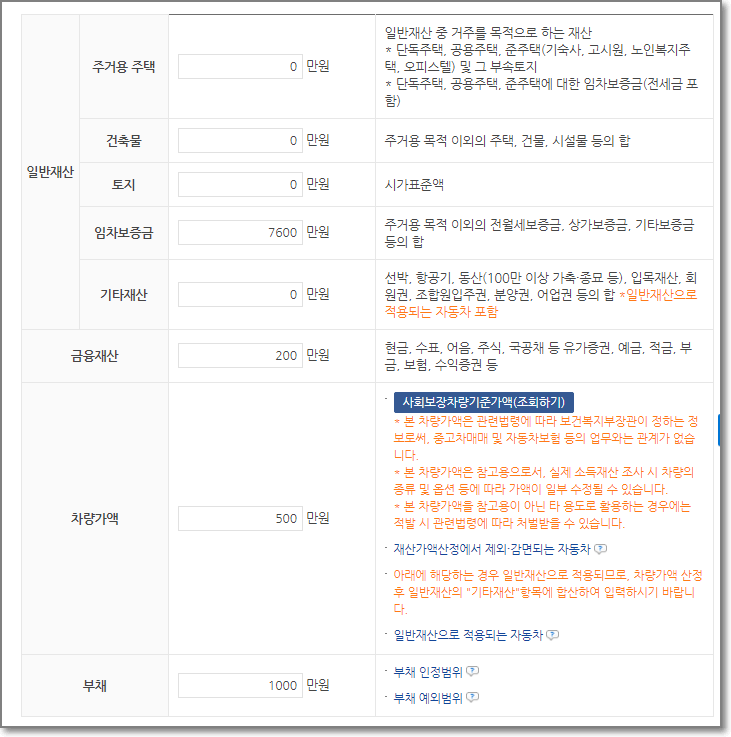 즉, 차량가액이 6880만원이고 월소득이 없을 경우 소득인정액은 6880만원이 되는 것입니다.