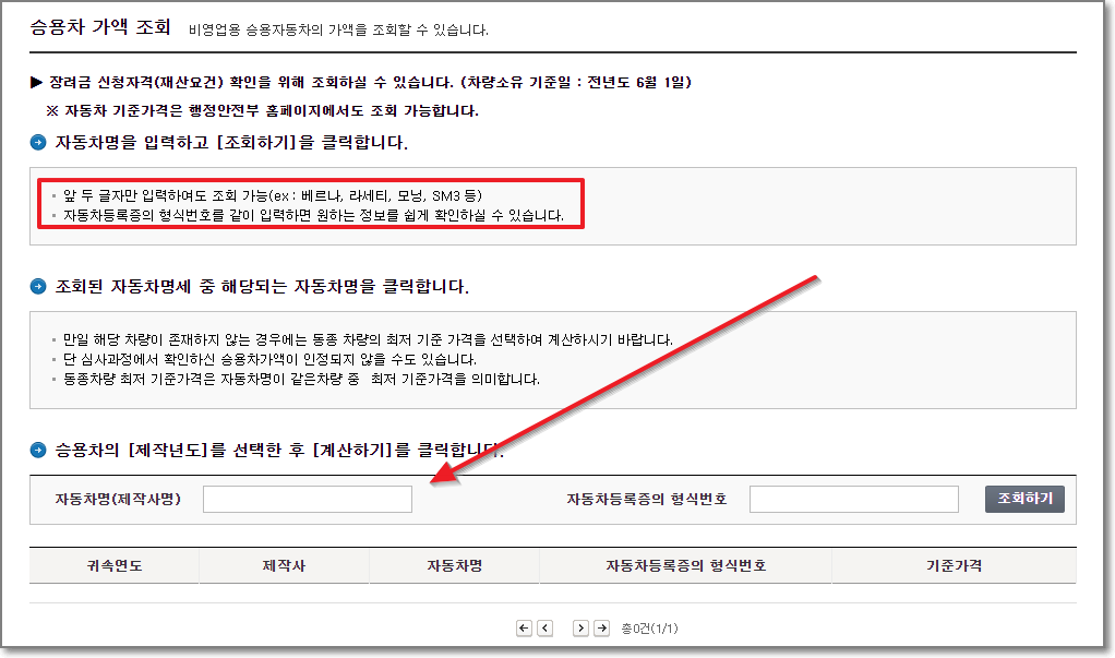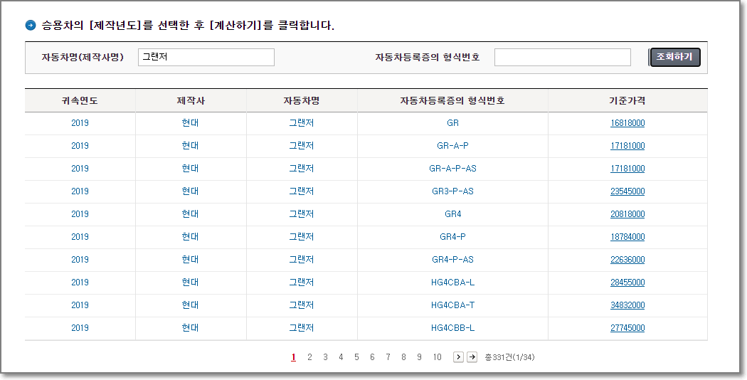 자동차명에 조회하고 싶은 자동차를 입력합니다. 여기서는 그랜저를 입력해보겠습니다.