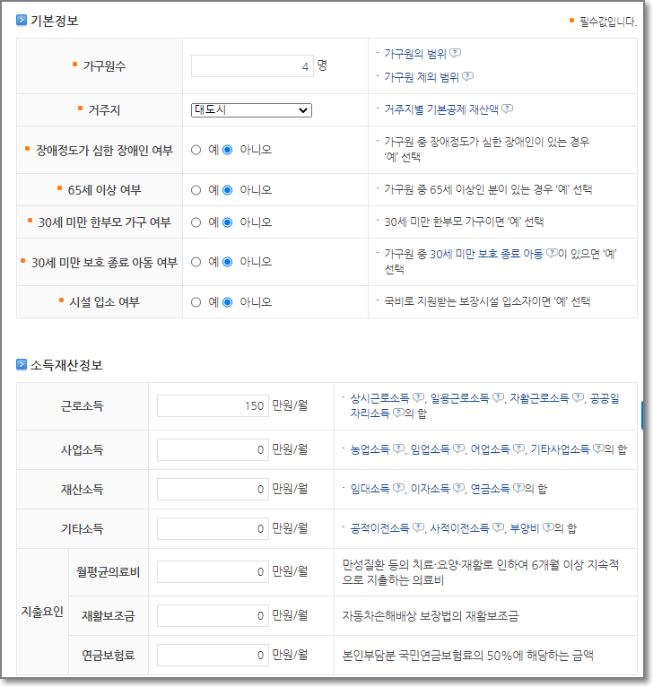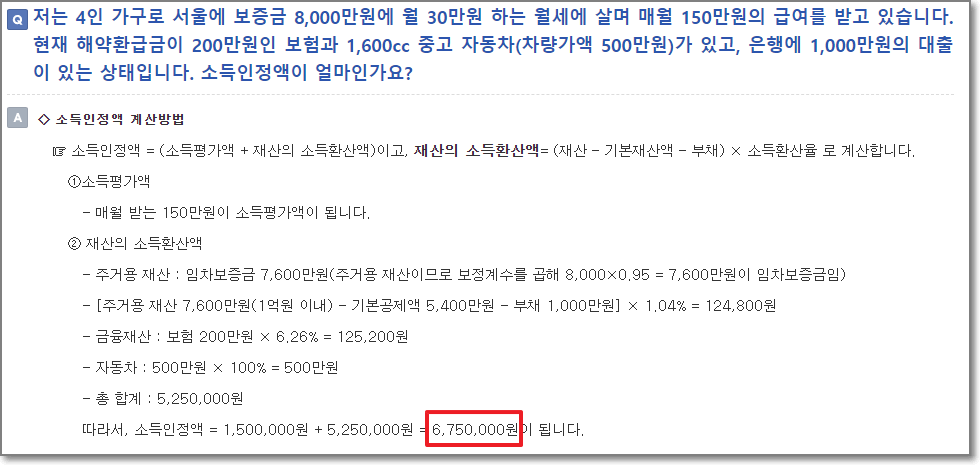 모의 계산기를 사용하여 아래의 예시가 실제로 소득인정액 675만원이 나오는지 보겠습니다.