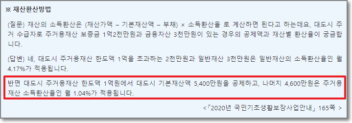 위의 재산환산방법을 보면, 8000만원 보증금에서 주택의 경우 보정계수 0.95를 하므로 7600만원이 되며, 기본공제 5400만원을 빼고 부채 1천만원을 빼면 1200만원이고 재산 소득환산율인 1.04%를 하면, 월 124,800원이 주거용 재산입니다.