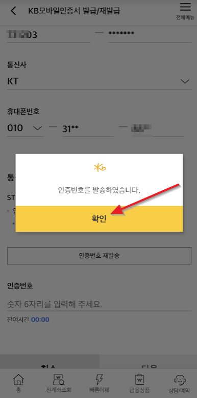인증번호를 발송하였다고 할 것입니다. 6자리 숫자가 문자로 오면, "인증번호"란에 써 넣습니다.