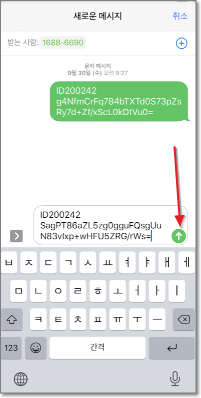 주민번호 입력 후 통신사 선택하시고 휴대폰번호를 누른 후에 "휴대폰명의확인"을 누르면 오른쪽 화면처럼 암호코드 같은것을 전송하라고 합니다. 써진 그대로 수정없이 전송하면 됩니다.