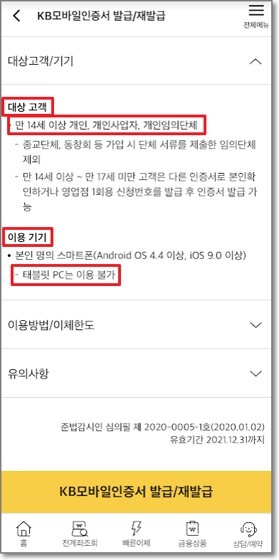 대상은 만 14세 이상 개인, 개인사업자, 개인임의단체 입니다. 어쨋든 만14세가 넘어야 합니다. 물론 14세 이상 17세 미만은 다른 인증서로 본인확인을 하거나 영업점에서 1회용 신청번호를 발급 후에 모바일 인증서가 발급 가능합니다.