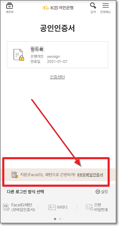 KB스타뱅킹 앱을 실행하면 공인인증서로 로그인하라고 나오면서 밑에 보면 지문(FaceID),패턴으로 간편하게! KB모바일인증서 라고 써있는 곳을 터치합니다.