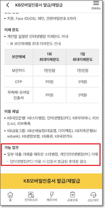 단, 기존에 이체한도가 모바일인증서를 발급 받는다고 변하지는 않습니다. 가능한 한도가 저렇다는 말이니까, 이체한도가 더 필요하면, 영업점을 방문해야 합니다.