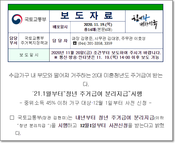 국토교통부 김현미 장관은 내년부터(2021년) 청년 주거급여 분리지급을 시행하고 12월1일부터 사전신청을 받는다고 밝혔는데요. 우선 주거급여란 무엇이냐면 저소득층의 주거비(월세)를 지원하는 제도입니다. 기존에는 가구주 기준으로 지급하던 주거급여를 따로 나가서 거주하게 된 청년에게도 기존에 가구주(부모님)에게 지급되는 것과 별도로 주거급여를 받을 수 있다는 것입니다.