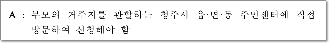 A : 부모의 거주지를 관할하는 청주시 읍·면·동 주민센터에 직접 방문하여 신청해야 함