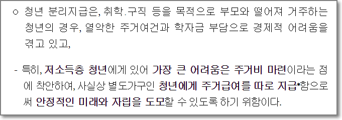 학업이나 구직 등을 목적으로 부모와 따로 거주하는 청년의 경우, 학자금 부담과 비싼 주거여건으로 인해서 경제적 어려움을 겪고 있고, 특히 저소득층 청년에게 있어 가장 큰 어려움은 주거비 마련이라는 점에 착안하여 사실상 별도가구인 청년에게 주거급여를 따로 지급함으로써 안정적인 미래와 자립을 도모할 수 있도록 하기 위함입니다.