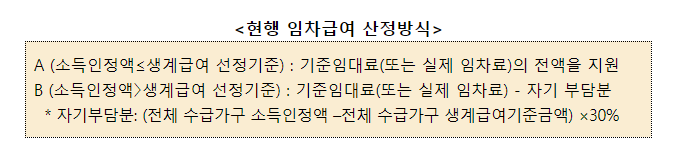 소득인정액과 생계급여 선정기준의 적용 방식은 현행 임차급여 산정방식을 적용하되, 자기부담분과 기준임대료 적용기준은 분리지급 취지에 맞게 별도로 마련하였습니다.