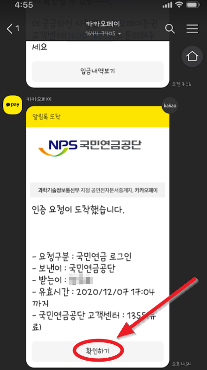 휴대폰의 카카오톡으로 무언가가 와있을 것입니다. "확인하기"를 누릅니다.