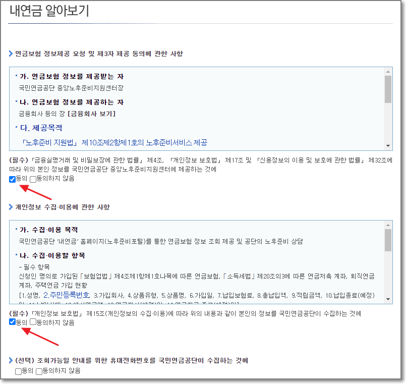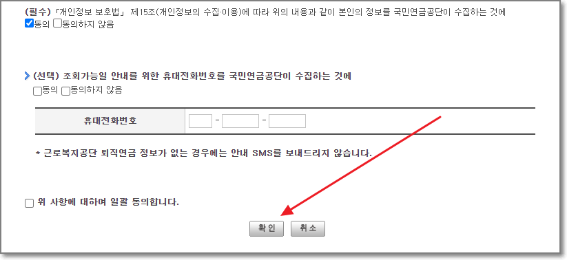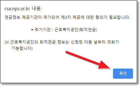 연금정보 제공기관이 추가되어 제3자 제공에 대한 동의가 필요하다는 창에서 "확인"을 누릅니다.