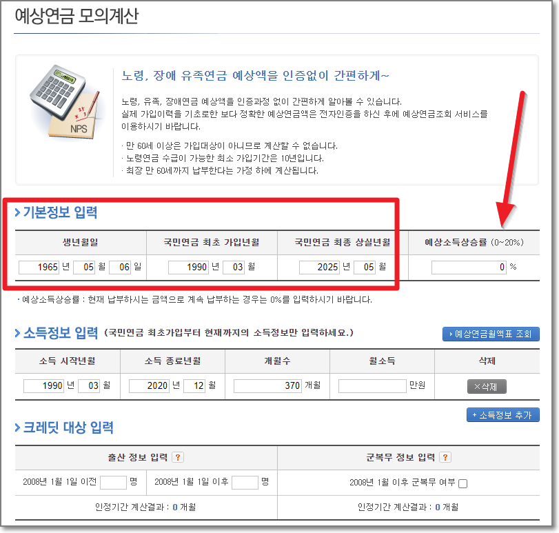 생년월일을 입력하고 국민연금 최초 가입년원을 입력하면 "국민연금 최종 상실년월"을 자동으로 입력됩니다. 그리고 예상소득상승률은 0%로 입력합니다.
