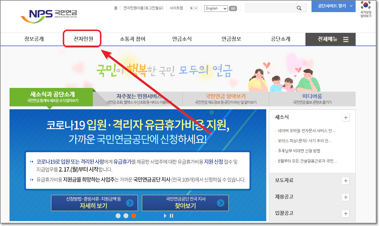 조회는 NPS(국민연금관리공단)에서 아주 간단하게 할 수 있습니다. 우선 링크를 눌러서 새창을 띄우시면 아래같은 화면이 나오게 됩니다. 화살표친 "전자민원"을 클릭합니다.