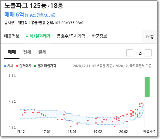 창원시 의창구의 한 아파트인 노블파크 32평은 지난 7월에 실거래가가 13층의 경우 4억3500만원이었는데 최근 11월에 매매된 것은 18층이 4억9900만원(이건 5억 이죠)이었으며 현재 호가는 외쪽그림에서 보다시피 6억 입니다.