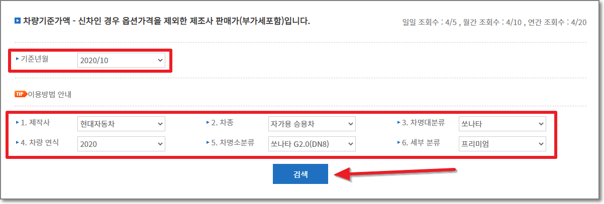 제작사/차종/차명대분류/차량연식/차명소분류/세부분류를 하나하나 선택을 합니다. 여기서는 쏘나타DN8 프리미엄으로 선택했습니다.(차량 연식은 차량등록증 상의 최초 등록년도입니다.) 검색을 누릅니다.