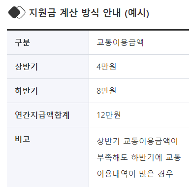 ◈ 연 최대 12만원 지원(예, 1~6월 지원금 4만원일 경우 교통이용금액에 따라서 7월~12월 지원금을 8만원까지 받을 수 있습니다.) 상반기 지원금 이월 운영(예, 상반기 1~6월 지원금이 계산상 8만원인 경우 상반기 지원금은 6만원이나 하반기 지원금에 2만원이 이월되어서 최대 6만원을 지원 받을 수 있습니다.)