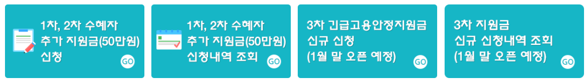아래에서 보시는 것처럼 1차,2차 수혜자 추가지원금(50만원) 신청은 바로 가능하지만 이번 3차에 새로 신청하시게 되는 분들은 신청자체가 1월말 오픈예정이기때문에 1월말에 신청하고 2월11일(구정연휴시작) 이전에 받게 하는데 최선을 다하지 않을까 합니다.