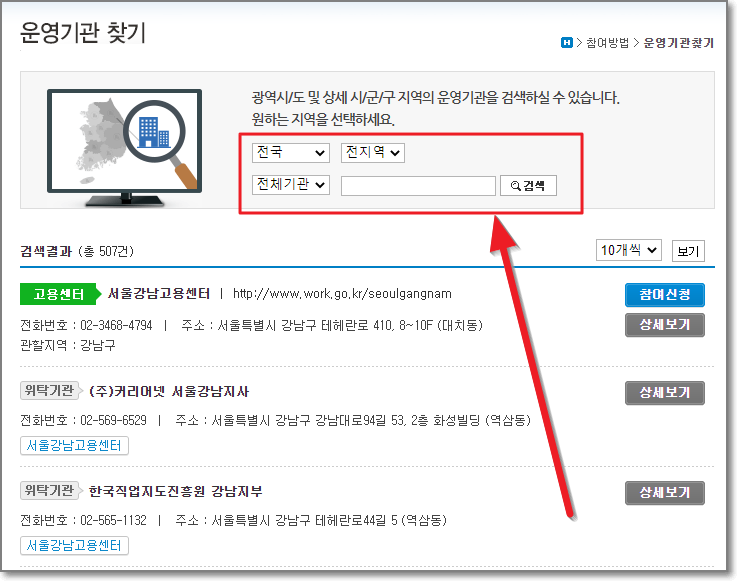 * 방문해야 하는 곳은 주민센터가 아니고 고용센터입니다. 고용센타 찾는방법은 고용센타찾기를 누르시고 아래와 같은 화면에서 찾으시면 됩니다.