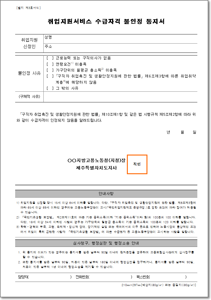 취업지원서비스 수급자격 불인정 통지서