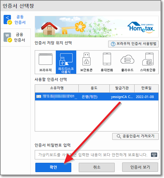 여기서는 공동인증서로 로그인을 하겠습니다. 아래처럼 암호입력하고 "확인"을 누릅니다.