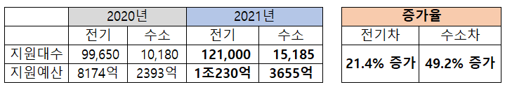 2021년에는 전기차 121000대(이륜차 2만대 포함), 수소차 15185대를 보급하여 총 136185대에 지원금을 지급할 계획입니다. 또한 충전기도 전기차 충전기는 31500기를, 수소충전소는 54기를 구축할 계획입니다.
