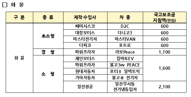 화물 전기차 지원금 전체물량의 10%를 중소기업에 별도 배정