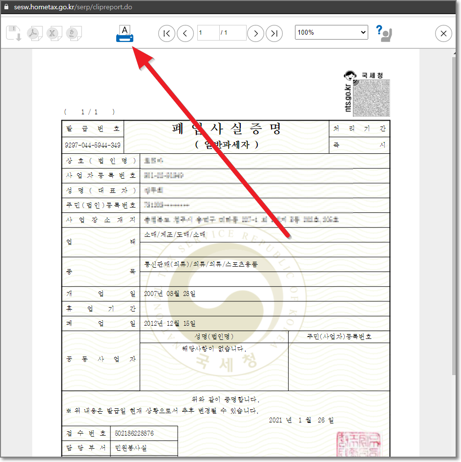 곧 연결되어 있는 프린터가 소리를 내면서 프린트를 하게 됩니다. 그리고 아래처럼 "폐업사실증명"이 프린트되어 나옵니다.