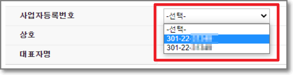 폐업사실증명 신청서에서 "사업즈등록번호"에 보면 -선택-이라고 되어있는 부분을 누릅니다.