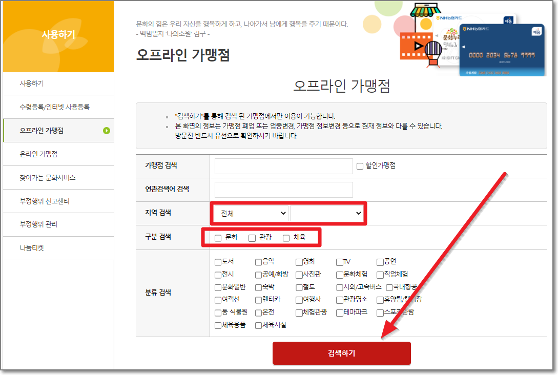 문화누리카드 오프라인 가맹점 찾기 바로가기를 눌러서 아래와 같은 창이 열리면 지역을 선택하고 구분의 3군데를 모두 체크하고 나서 검색하기를 누릅니다.