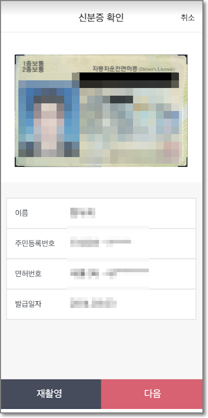 신분증 확인 절차가 나오는데요. 혹시 주민등록증이나 운전면허증에 주민번호 뒷자리 가린 스티커가 붙어있다면 제거하고 나서 촬영칸에 넣으시면 인식이 잘됩니다.