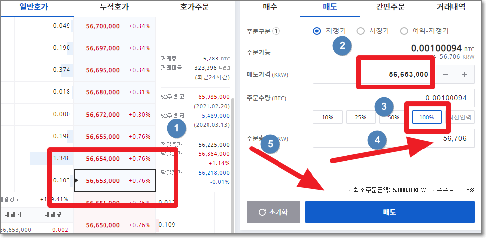 아래 화면처럼 번호 순서대로 하시면서 마지막에 매도를 누르시면 됩니다.(이 글을 쓰고 있는 몇 분 만에도 가격이 변하고 있습니다. 가격이 내려가고 있네요)