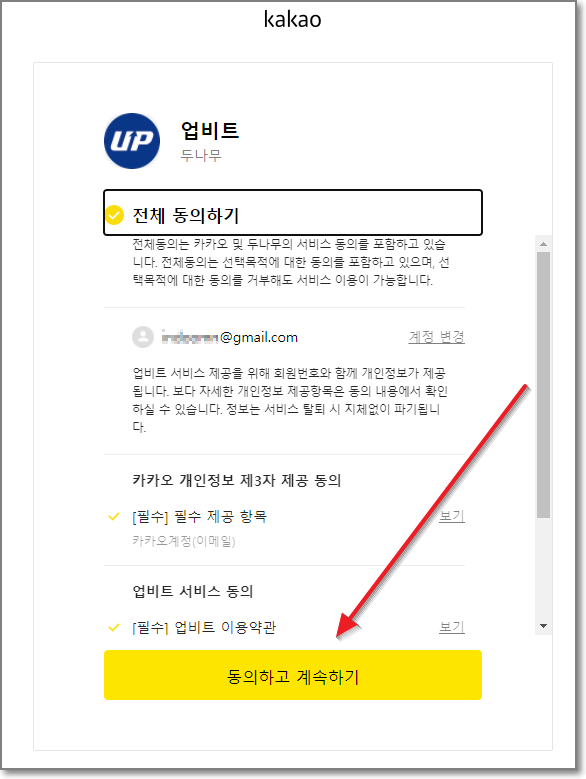 업비트는 두나무라는 회사가 운영하고 있습니다. "전체 동의하기"를 누르시고 맨 아래 있는 "동의하고 계속하기"를 누릅니다.