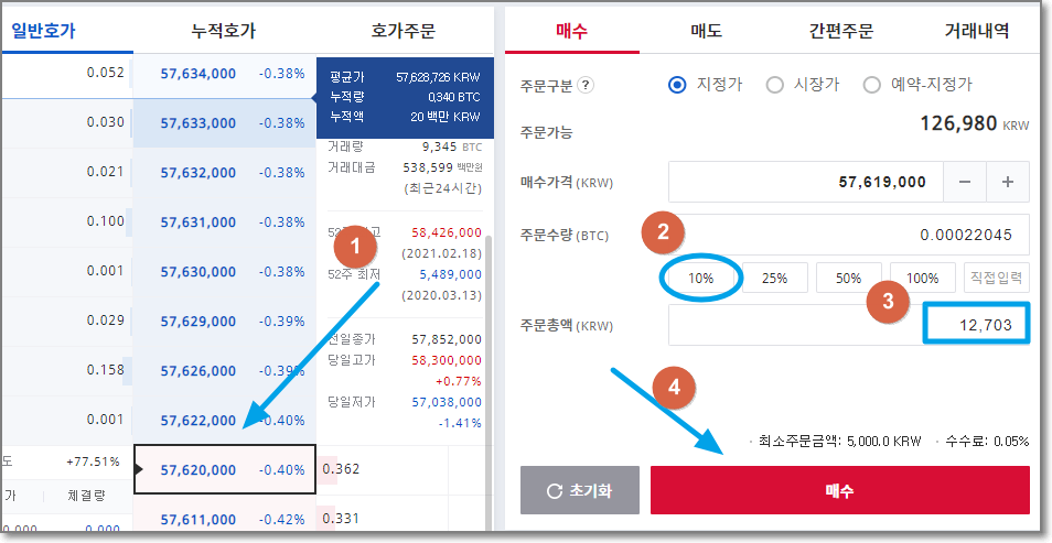 3가지 옵션으로 구매할 수 있는데요. 주문 수량은 1 비트코인 또는 0.1비트 코인 0.001비트 코인 등으로 직접 입력해서 구매하는 방법이고, 그 밑에 퍼센트는 현재 가지고 있는 원화의 퍼센트대로 살 수 있는 방법이며, 3번 주문 총액은 1만 원어치, 또는 10만 원어치 등 금액을 지정해서 살 수 있는 방법입니다.