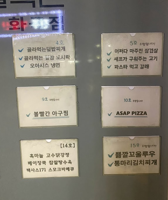 출입문은 영업을 하는 시간에도 열리지 않고 빨간 박스 쳐놓은 창문만 열리고 음식을 배달원에게 주는 방식이었습니다. 그런데 며칠 더 배달을 하다보니 이번에는 정말 전문화된 음식점을 발견할 수 있었는데요.