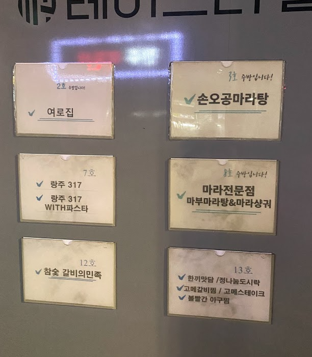 바모스 치킨, 24시미아감자탕, 거기시켜 덮밥&간식, 여로집, 랑주317(파스타집), 참숯 갈비의 민족, 손오공마라탕, 마라전문점(마부마라탕&마라샹궈), 한끼맛담/정나눔도시락, 고메갈비찜/고메스테이크, 볼빨간 아구찜, 골라먹는덮밥찌개, 골라먹는 덮밥 도시락, 오아시스 냉면, 볼빨간 아구찜, 흑마늘 고수닭강정, 베이징쿡 찹쌀탕수육, 텍사스171 스모크바베큐, 어쩌다 마주친 삼겹살, 셰프가 구워주는 고기, 파스타 먹고갈래, ASAP PIZZA(가능한 빨리 피자), 쁢깔꼬울루우, 통마리김치찌개