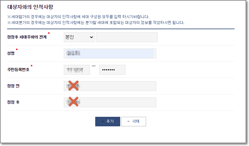 아래의 항목에서 세대주 변경은 아무것도 안넣어도 되지만 "세대합가"나 "세대분가"의 경우에는 대상자 인적사항에 세대 구성원 전부를 입력해야 합니다. 그리고 정정 전과 정정 후에는 아무것도 입력하지 않으셔도 됩니다.