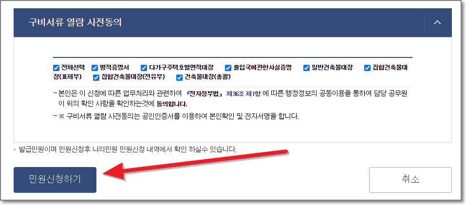마지막으로 위에서 말한대로 "세대주 확인절차"를 거치므로 구비서류 열람이 필요하므로 사전동의를 모두 해야 합니다. 모든 동의에 체크되어 있는 것을 확인하고 "민원신청하기"를 누릅니다.