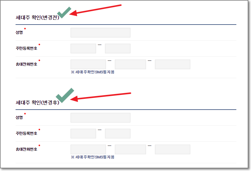 다음으로 한번더 확실하게 확인하는 절차가 나오는데요. "변경전"의 세대주 성명과 주민번호 휴대폰번호를 입력하고, "변경후"의 세대주 성명과 주민번호와 휴대폰번호를 입력합니다.