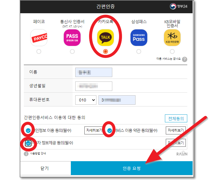 간편인증에서 많은 분들이 쓰고 계신 "카카오톡"으로 인증을 해보기로 하겠습니다. 카카오톡을 선택하고 이름과 생년월일 8자리(예:19990209)와 휴대폰번호를 입력하고 밑에 있는 간편인증에 대한 동의를 모두 체크하고 "인증요청"을 누릅니다.
