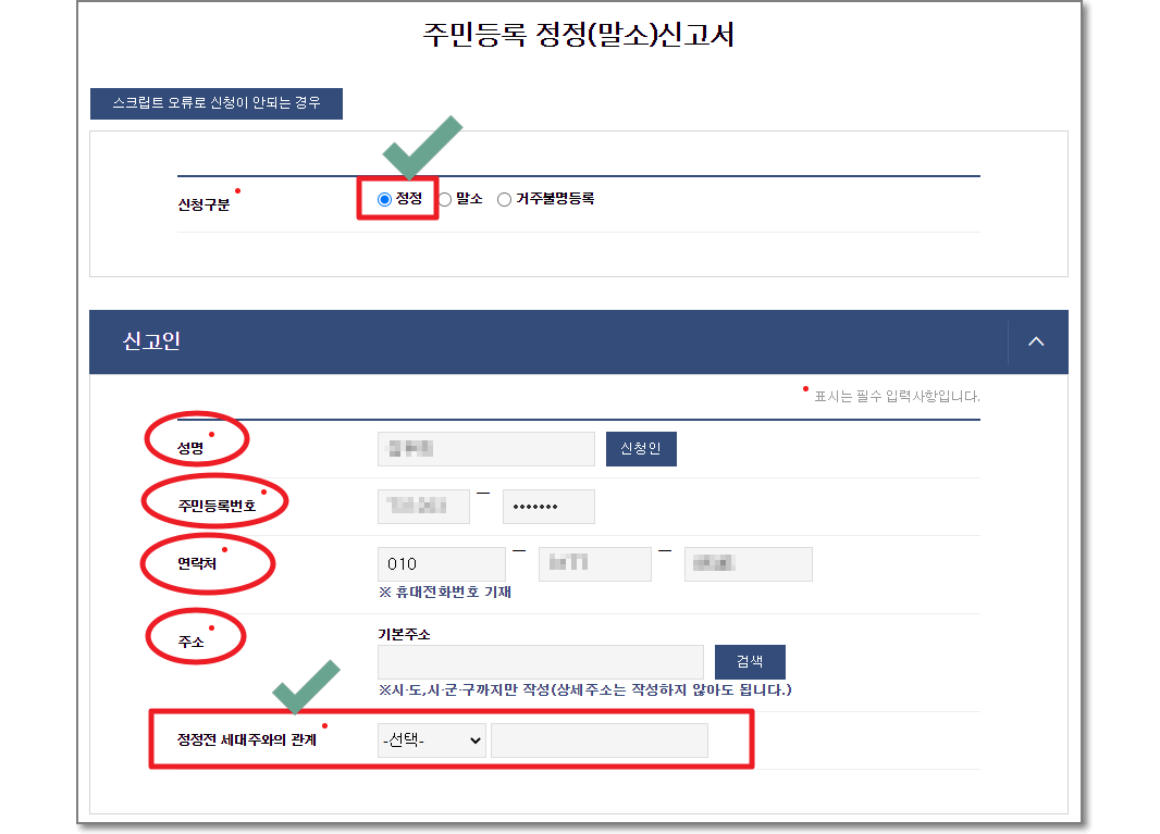 드디어 "주민등록 정정(말소)신고서"입니다. 여기서 신청구분은 "정정"으로 하시고 신고인(신청인)의 성명과 주민등록번호, 연락처, 주소를 쓰시고 "정정전 세대주와의 관계"를 고릅니다. 여기서 많이들 헷갈려 하시는데요. "정정전" 즉 "현재"의 세대주와의 관계를 쓰라는 것입니다. 즉 아직 바꾸지 않은 세대주와 본인은 어떤 관계인가를 쓰라는건데요. 만약 아버지면 세대주인 아버지와 신청자인 나의 관계는 "자녀"인 것입니다.(옆에 빈칸은 기타일때만 입력합니다.)
