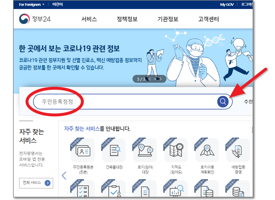 이제 로그인이 된 "정부24"화면에서 화면 중앙에 있는 검색창에 "주민등록정정"이라고 쓰고 돋보기를 누릅니다.