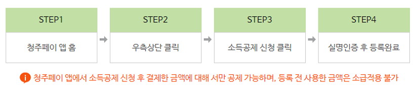 청주 페이 앱에서 소득공제를 신청할 수 있는데요. 이때 주의할 점은 신청을 한 이후에 사용한 금액에 대해서만 소득공제가 가능하다는 것입니다. 소득공제 신청방법은 청주페이앱의 우측상단에 줄3개를 터치하고 소득공제 신청을 누른다음 실명인증 후 등록하면 됩니다.